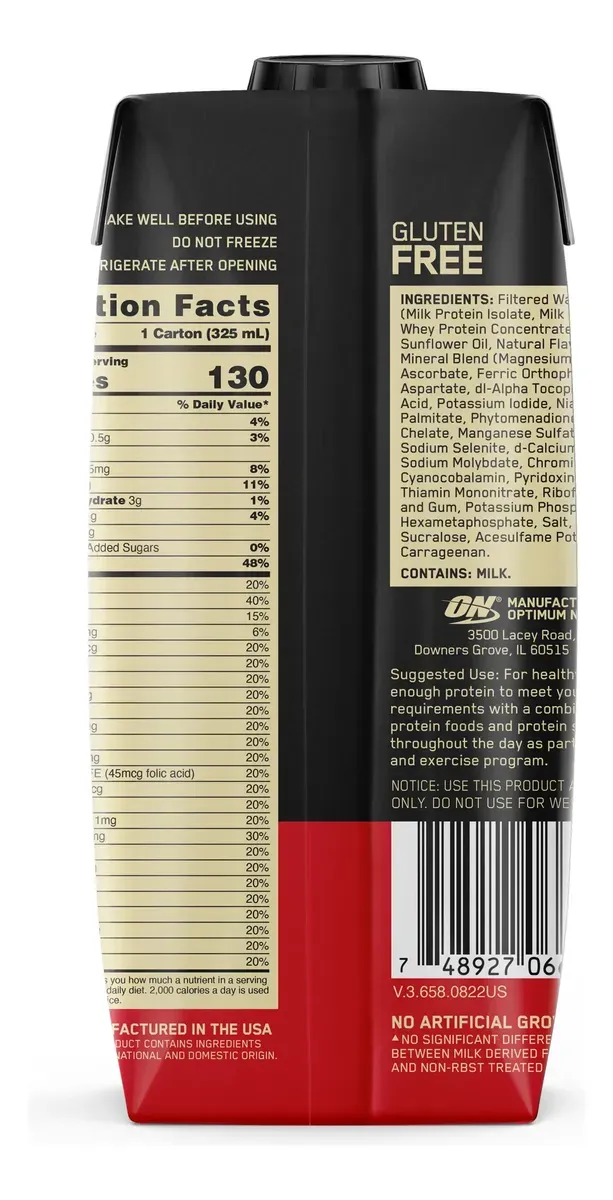 El GOLD STANDARD Ready To Drink (RTD) Protein Shake de Optimum Nutrition te ofrece la máxima calidad proteica en el formato más cómodo. Es la solución perfecta para alcanzar tus metas nutricionales diarias sin necesidad de mezclar ni ensuciar. Disfrutá del sabor, la textura y la consistencia inigualables del Gold Standard en cada sorbo, ¡listo para tomar donde sea que vayas!