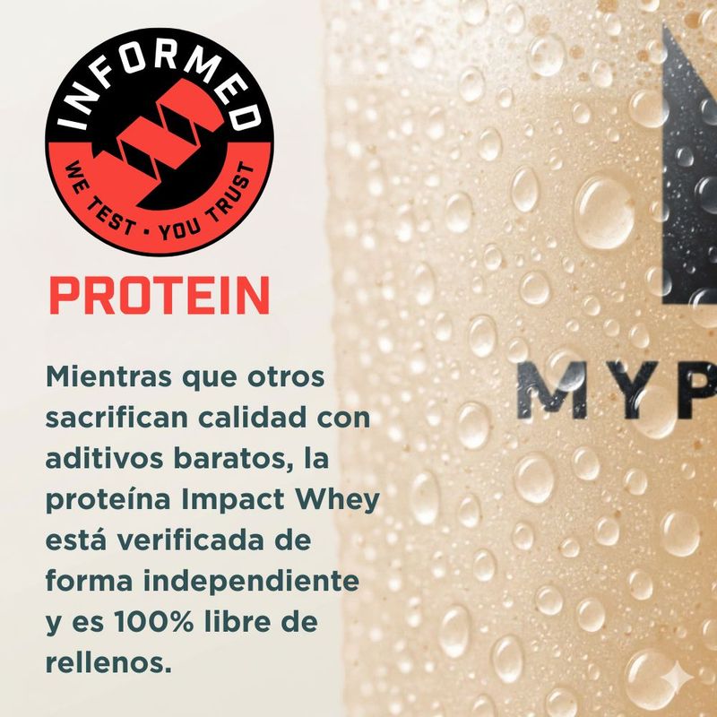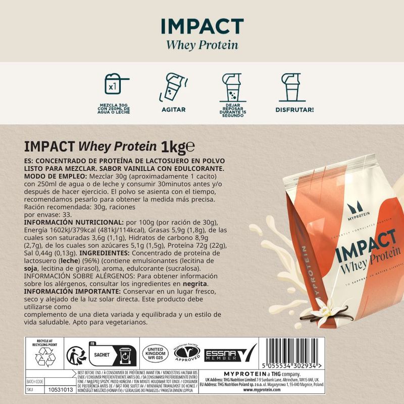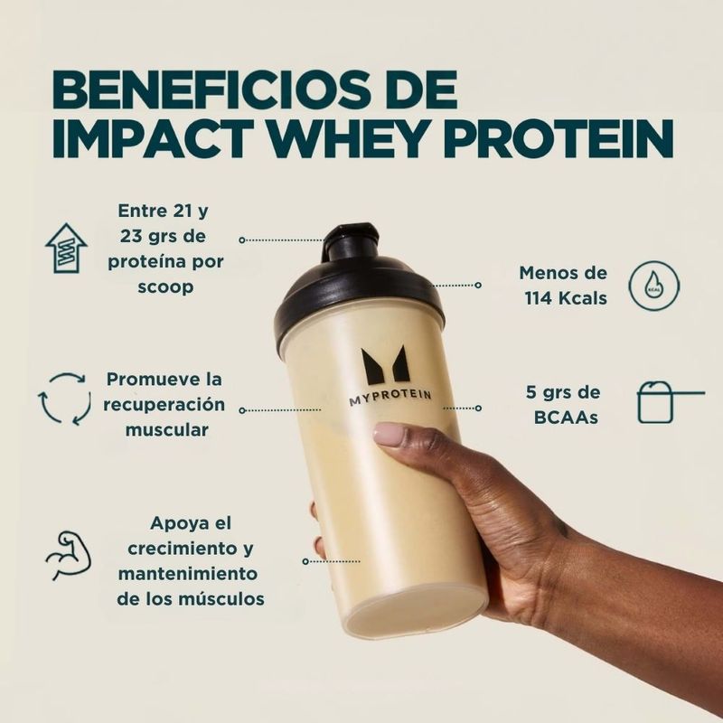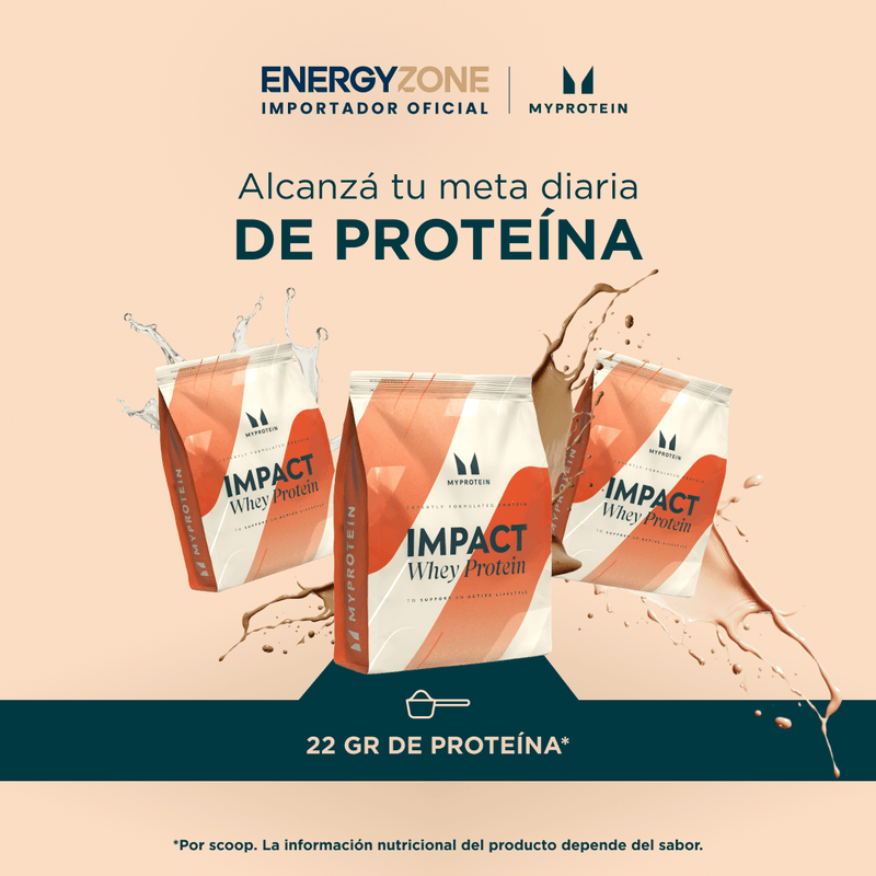 Impact Whey Protein de Myprotein es una proteína de suero en polvo diseñada para favorecer el crecimiento y mantenimiento de la masa muscular, mejorar la recuperación y aportar una nutrición de calidad a tu rutina diaria. Es una de las proteínas más elegidas a nivel mundial por su pureza, disolución y variedad de sabores.