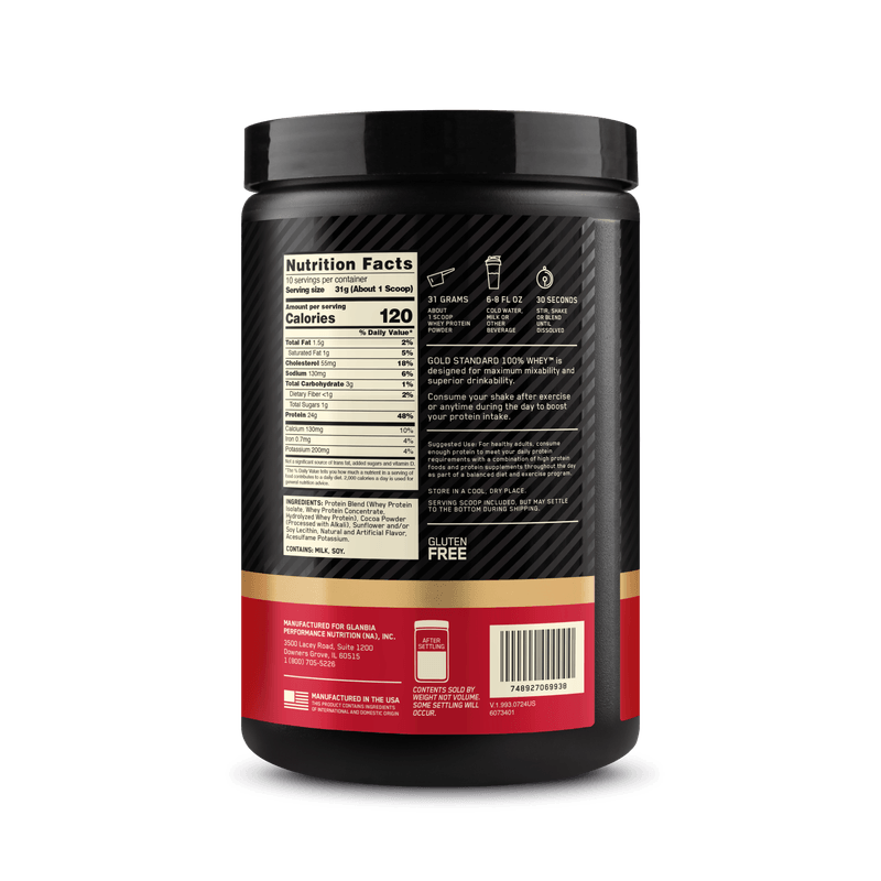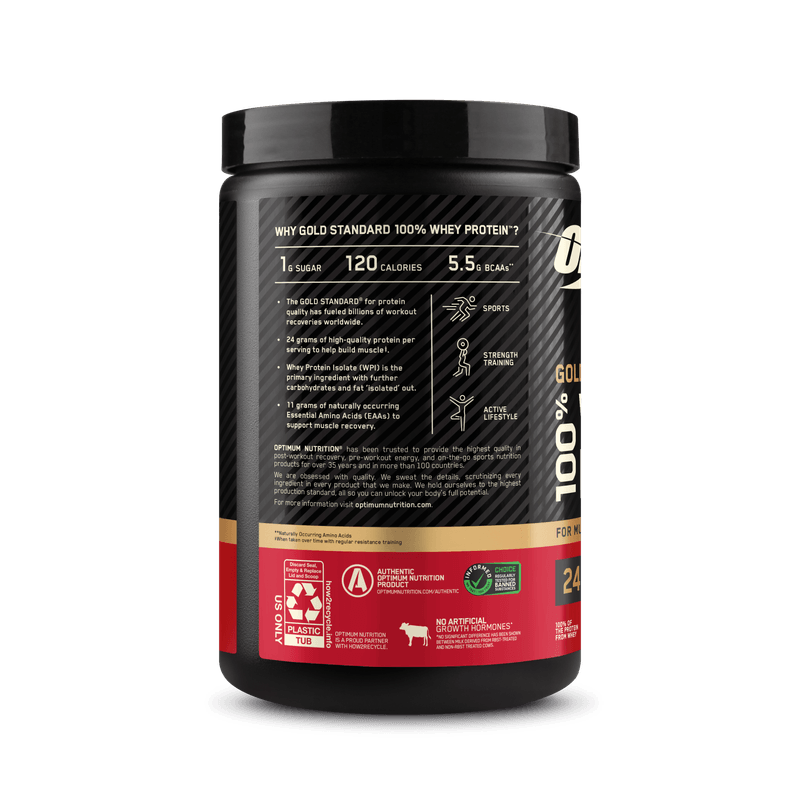 Cada servicio de Proteína Gold Standard Whey está repleto de microfracciones de proteína de suero biológicamente activas, como alfa-lactoalbúminas, glicomacropéptidos, beta-lactoglobulinas, inmunoglobulina G, lactoferrrinas, lactoperoxidasas y diversos activadores del crecimiento. Además, se ha enriquecido con 4 gramos de glutamina y precursores, así como 5 gramos de BCAAs (aminoácidos ramificados) en cada toma. ¡Potencia tus resultados fitness y alcanza tus objetivos con la Proteína Gold Standard Whey de Optimum Nutrition!